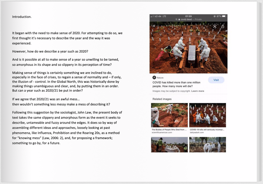 Following this suggestion by the sociologist, John Law, the present body of text takes the same slippery and amorphous form as the event it seeks to describe, untameable and fuzzy around the edges. It does so by way of assembling different ideas and approaches, loosely looking at past phenomena, like Influenza, Prohibition and the Roaring 20s, as a method for “knowing mess” (Law, 2006: 2), and, for proposing a framework; something to go by, for the future.