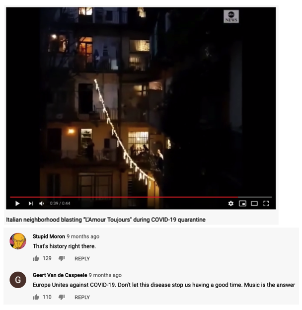 Another moment of unity, which is also marked by its link to Eurodance and Euphoria, was the one in Turin, Italy, where a DJ played Gigi D’Agostino’s “L’amour Toujours” (1999) from his balcony. Despite of the strict lockdown and the precarious situation in Italy, neighbours could have a moment of togetherness, if only from their balconies and windows, with Gigi’s “I’ll fly with you” in their ears. Whilst not being able to leave their homes, the music could transport people by way of a shared moment of joy and beckon for a time when the internet goes back to what it should be: merely a means of communication when and where to meet-up IRL, not an enforced replacement.